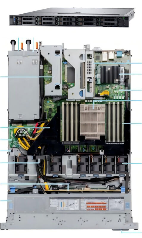 1. riser 1A 2. mini PERC card 3. system board 4. processor 5. slot modul memori 6. kipas 7. label informasi 8. penutup backplane 9. backplane 10. kabel retention latch 11.Papan penengah daya 13. Air shroud 14. Riser 2 15. PSU 1 dan PSU 2